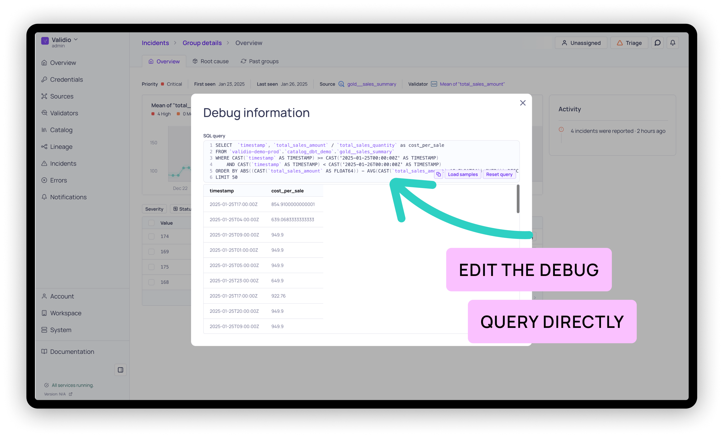 - Editable debug query: Expand and edit data issue debug queries directly to make root-cause analysis easier.