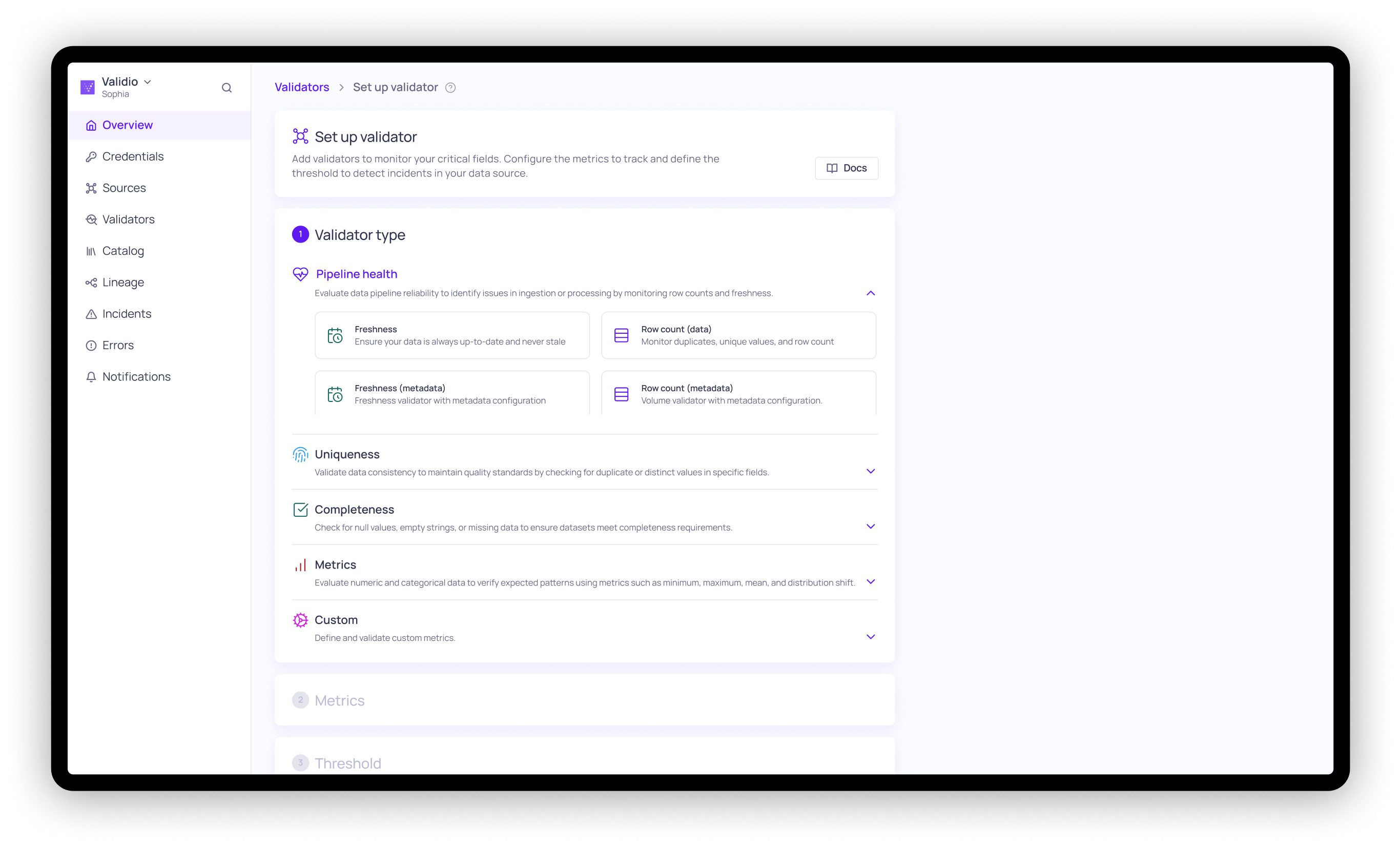 - Use case based validator setup: The validator wizard has been simplified and redesigned to be based around data quality use cases and categories of validations, such as pipeline health, data consistency, and completeness.