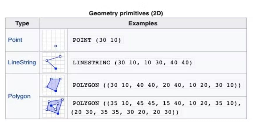 There are many standards to represent those three primitives. Some of the most popular ones are called WKT, WKB, and GeoJSON. Below we can see examples of how to represent those primitives using WKT, which is a very lightweight format. A point is represented as a pair of coordinates, a line is a sequence of points, and polygons are lines that form a region.