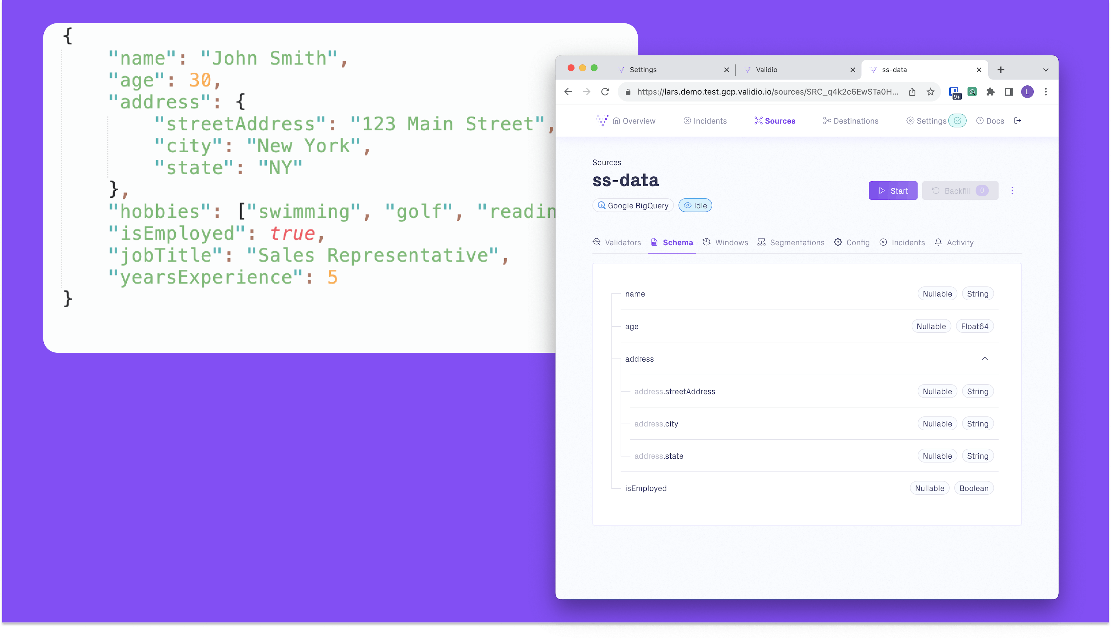 One of the benefits of validating all data in one place and as early as possible is that it reduces the risk of propagating errors downstream. For instance, imagine that you have a web API that sends JSON data to your BigQuery Data Warehouse. If there is an error in the JSON data, such as a missing field or an invalid value, it will affect your Data Warehouse and any downstream processes or applications that rely on it. By validating the JSON data before it enters your Data Warehouse using Validio, you can catch and fix the error at the source and prevent it from affecting your entire data pipeline.
