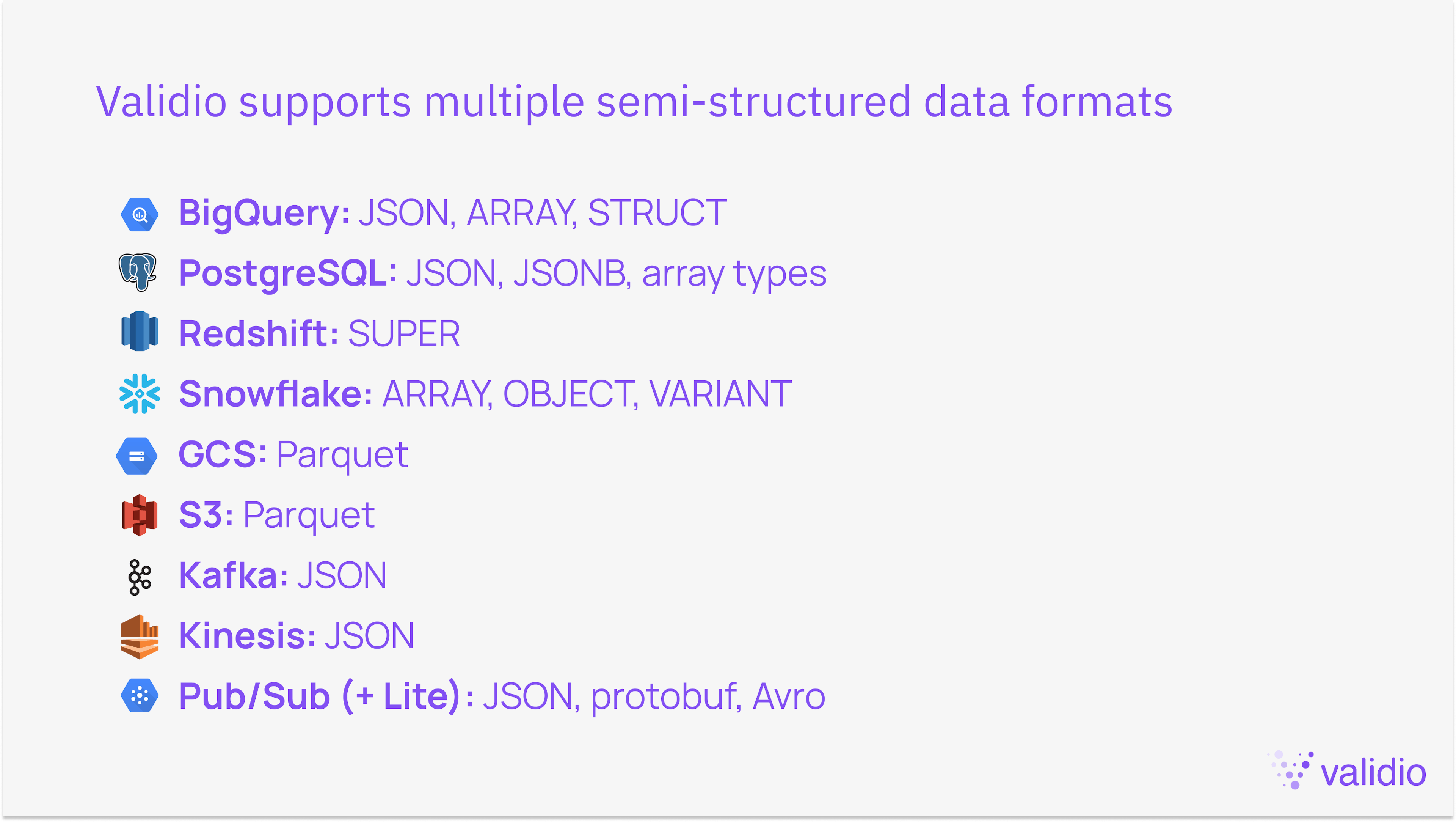 In the first release of the semi-structured data support, Validio adds support for the following: