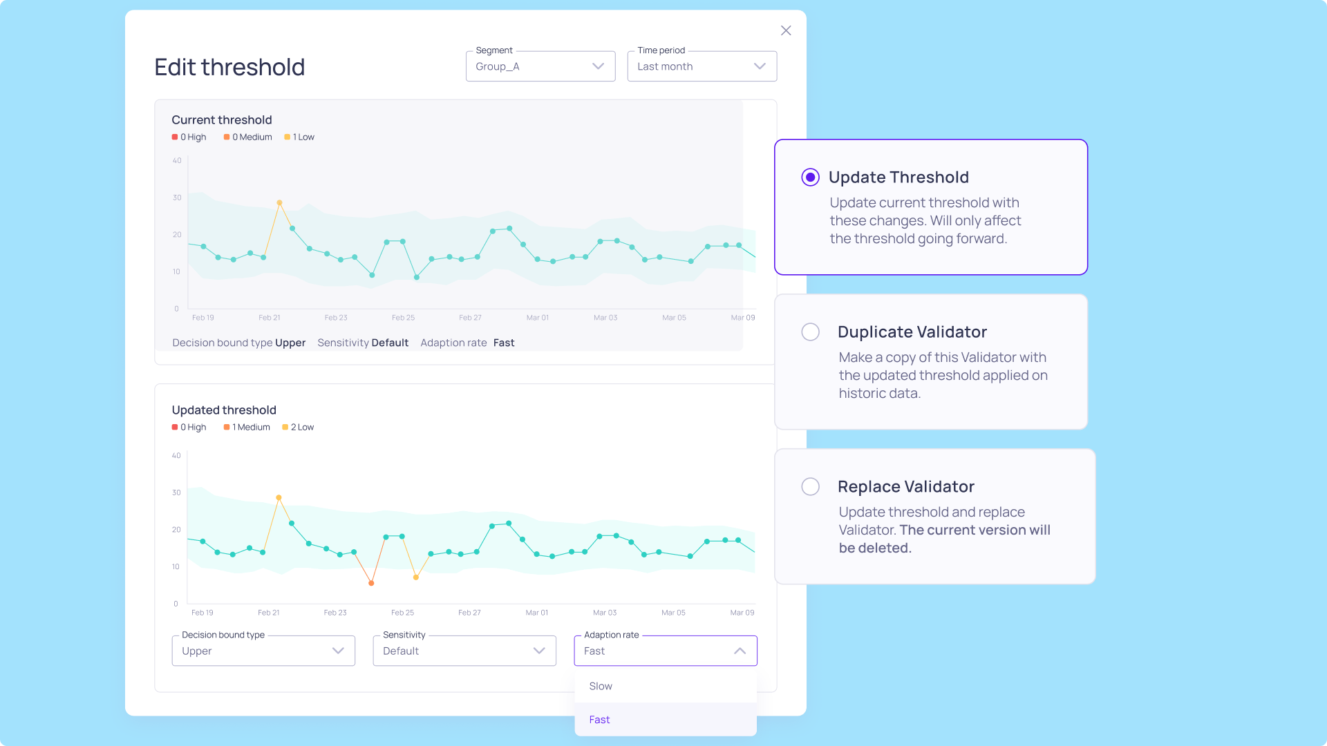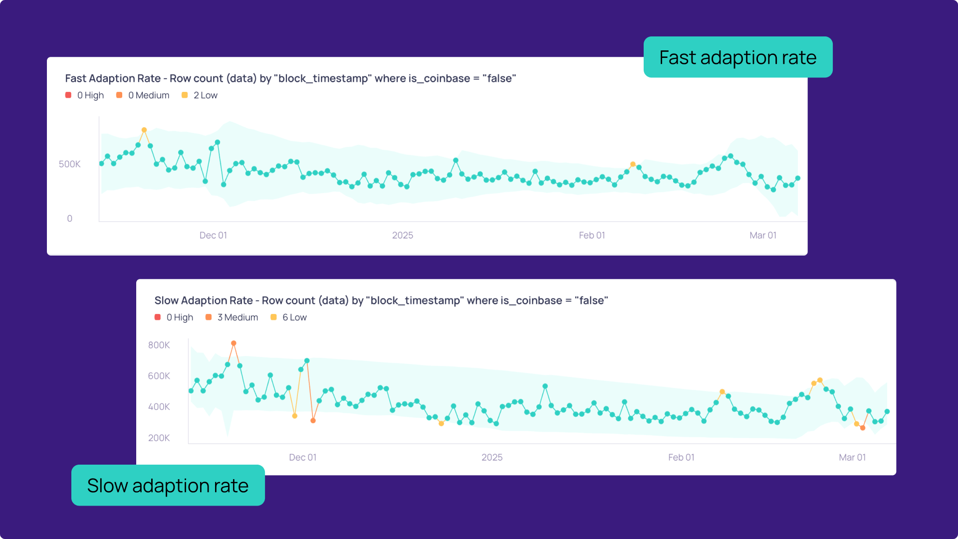 Getting the most out of automated anomaly detection often means fine-tuning how the system learns from your data. While Validio excels at automatically identifying outliers, understanding the nuances of your data's behavior allows for even more precise monitoring. That's why we've introduced the Adaption Rate setting for our Dynamic Thresholds, giving you greater control over how our anomaly detection bounds respond to changes in your data.