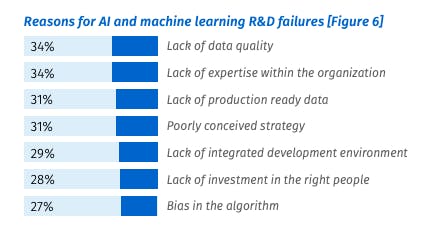 Fast forward to 2021 and the situation seems to only have worsened: 34% of the respondents in a recent Rackspace survey, which included 1,870 organizations in a variety of industries, stated poor data quality as the main reason for the failure of machine learning R&D, and another 31 percent said they lacked production-ready data.