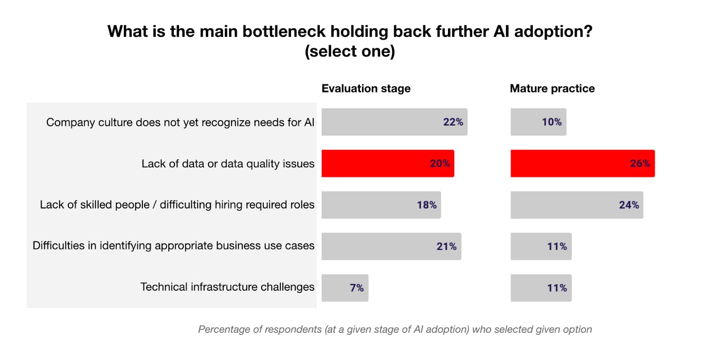 In a survey by O’Reilly from 2019, 26% of the respondents with a mature machine learning practice stated poor data quality as the nr 1 bottleneck holding them back from further AI/ML adoption.