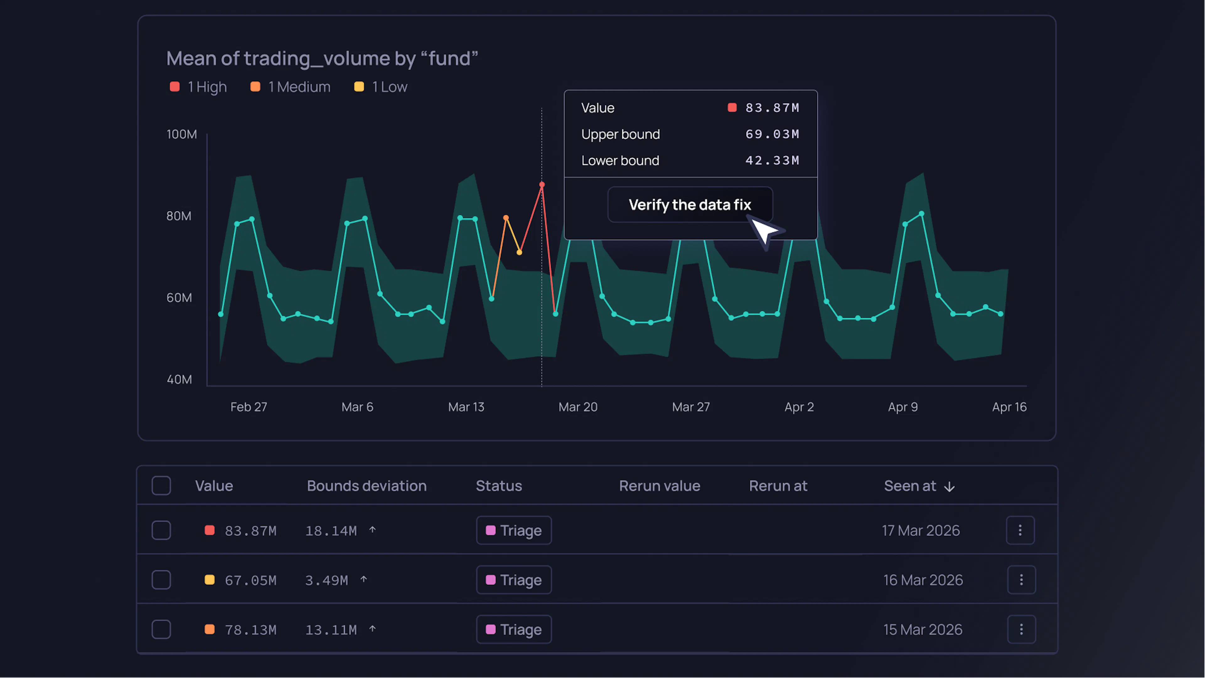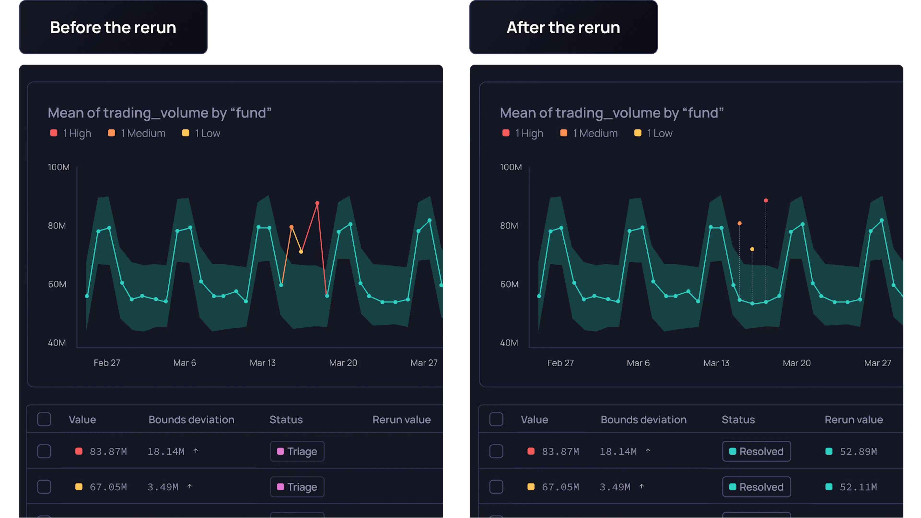 Wait for the next check. If your validators use global windows (a full table scan each cycle), the next poll will eventually pick up the corrected data. But the result is just another data point on the chart. There's no connection between the original failure and the new value. No audit trail. No proof that a specific incident was detected and then resolved.