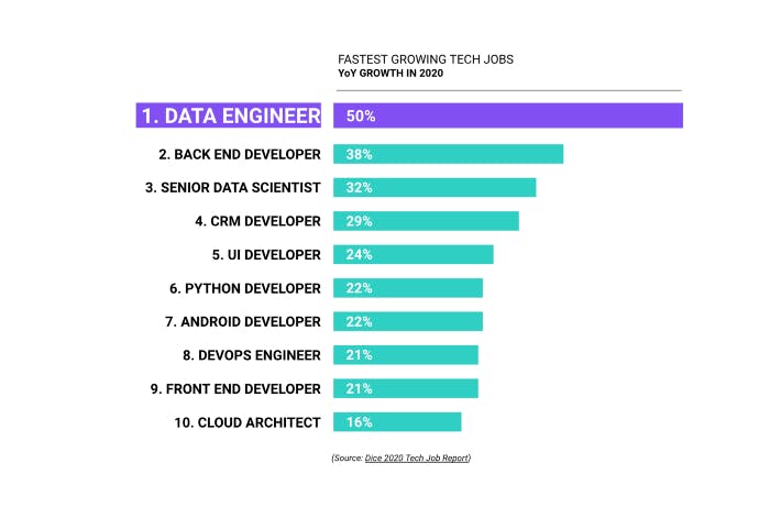 Dice’s 2020 tech jobs report cites data engineering as the fastest-growing job in tech in 2020, increasing by a staggering 50%.