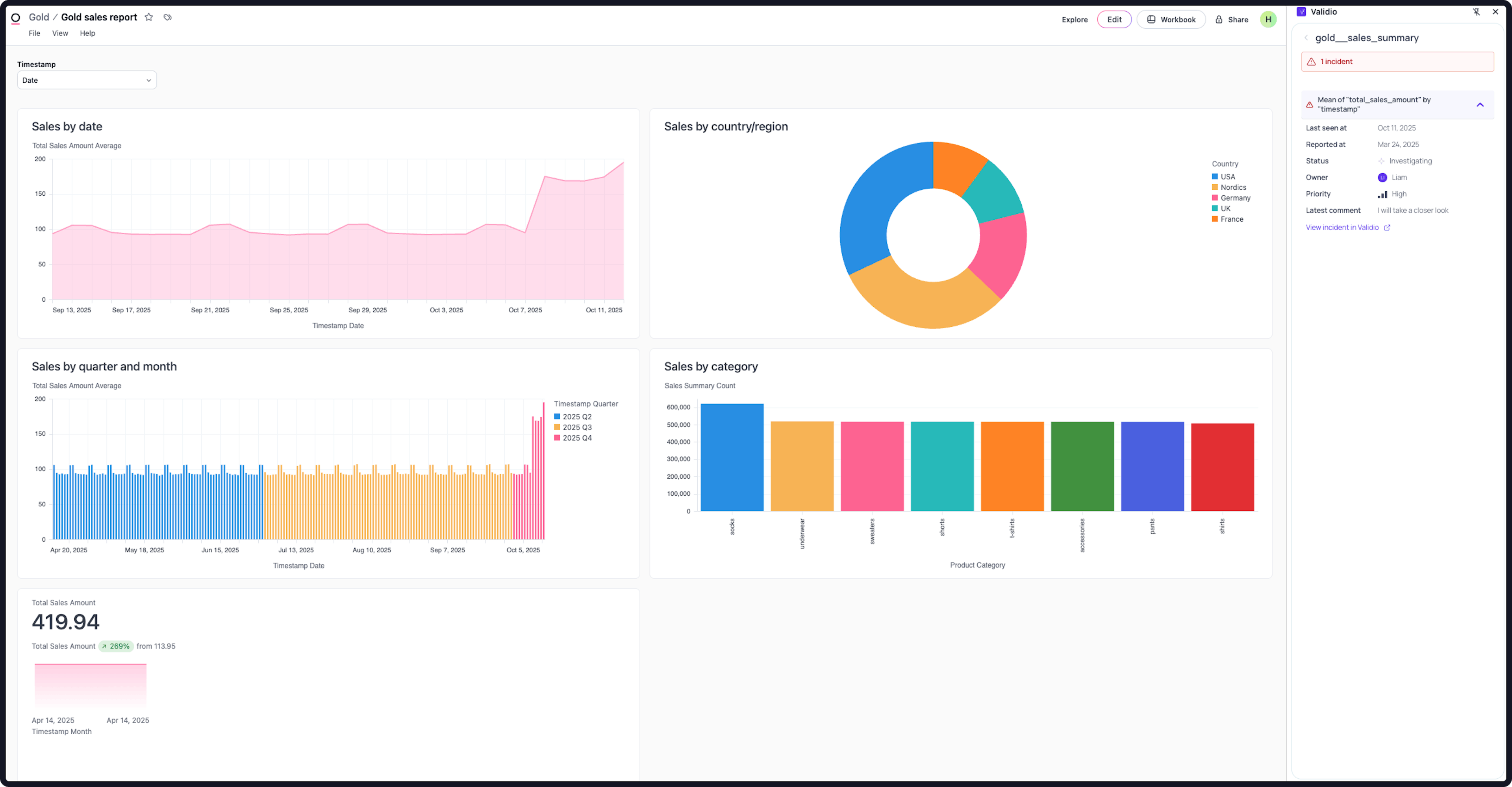 That’s why we built the Validio x Omni integration. It connects your data assets in Omni’s business intelligence & embedded analytics platform directly to Validio, to make sure users get fast AI answers and beautiful dashboards that are easy to understand and trustworthy. The Validio x Omni integration enables data teams to bring their canonical sources of truth – metrics – into the same data quality and lineage ecosystem that powers their pipelines, bridging the final gap between data and better decision-making.
