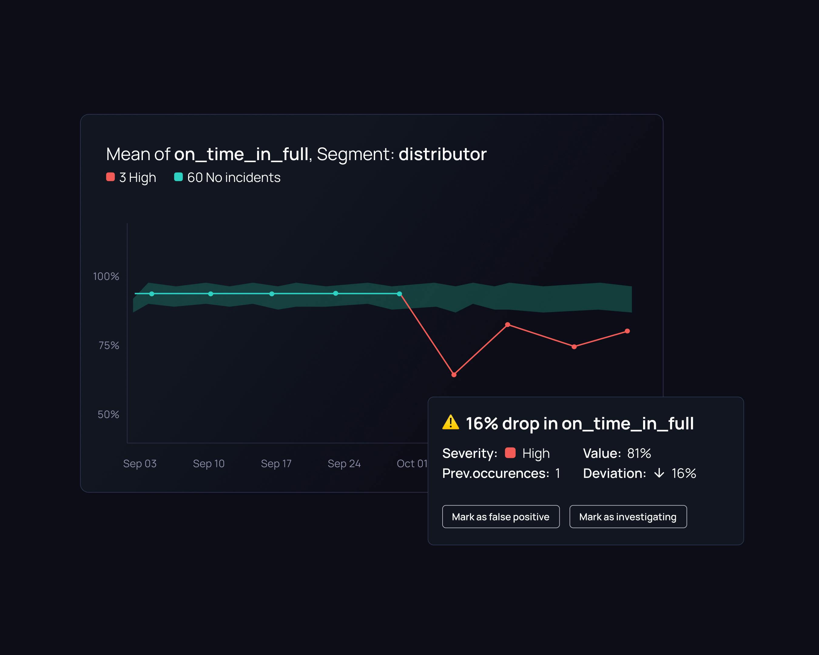 Monitor data across supply chain, inventory and distribution to catch deviations before they impact on-time delivery.
