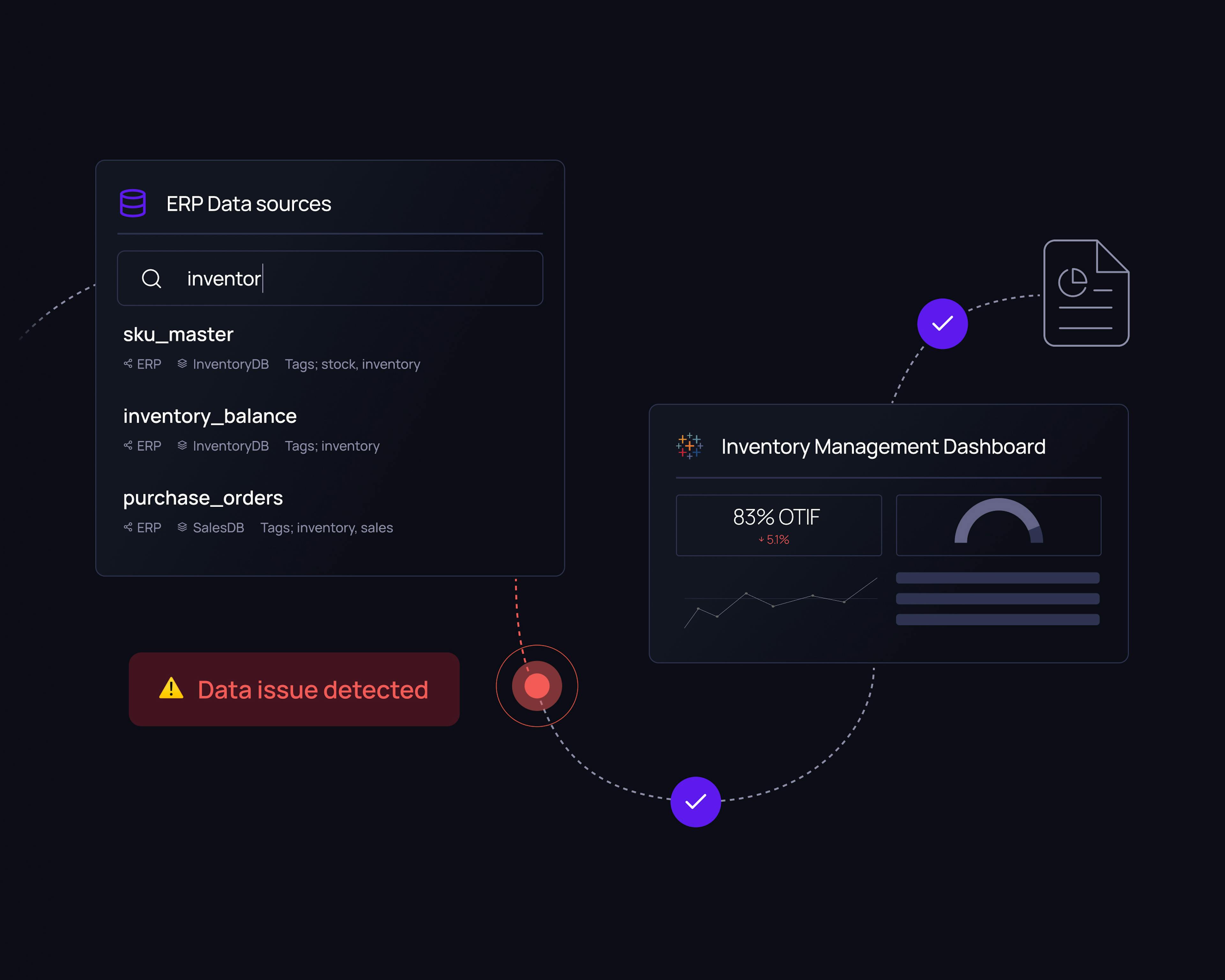 Gain visibility into inventory, distribution and sales to directly detect deviations signalling inaccurate routing, warehouse issues, or mismatch in stock and orders. Control working capital and avoid inventory inefficiencies by continuously monitoring operational and analytical data and metrics.