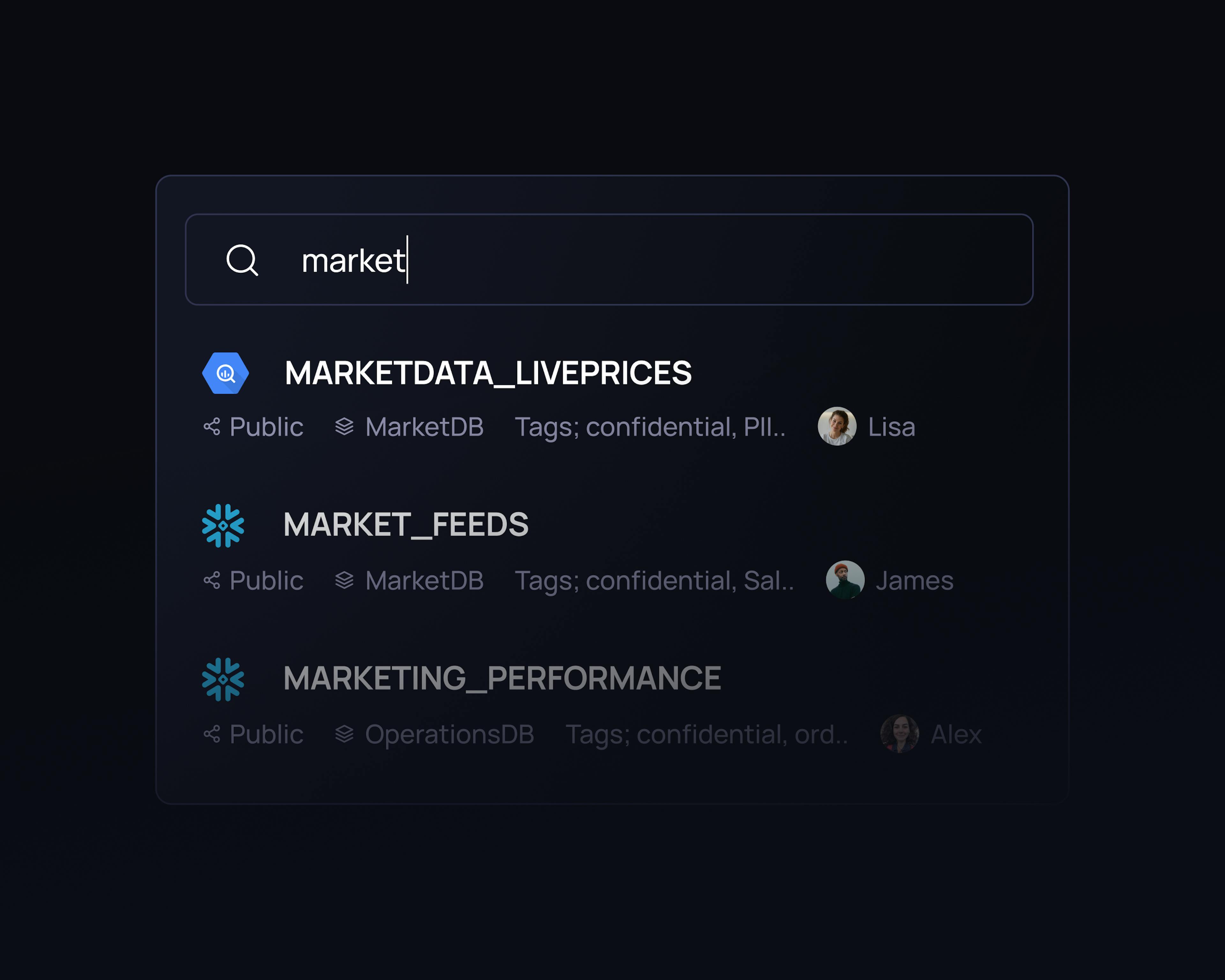 Find and filter the data you need based on metadata tags and descriptions. Search across data warehouses, streams, and lakes.