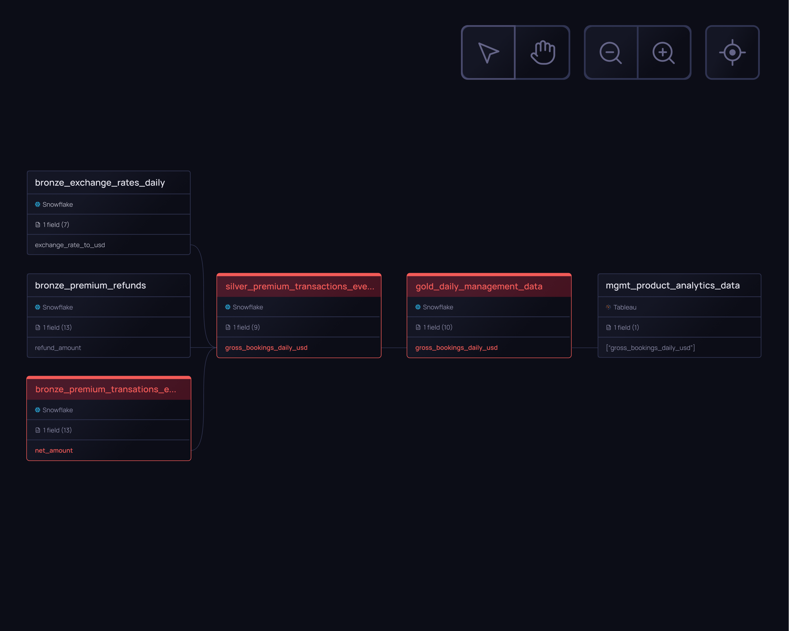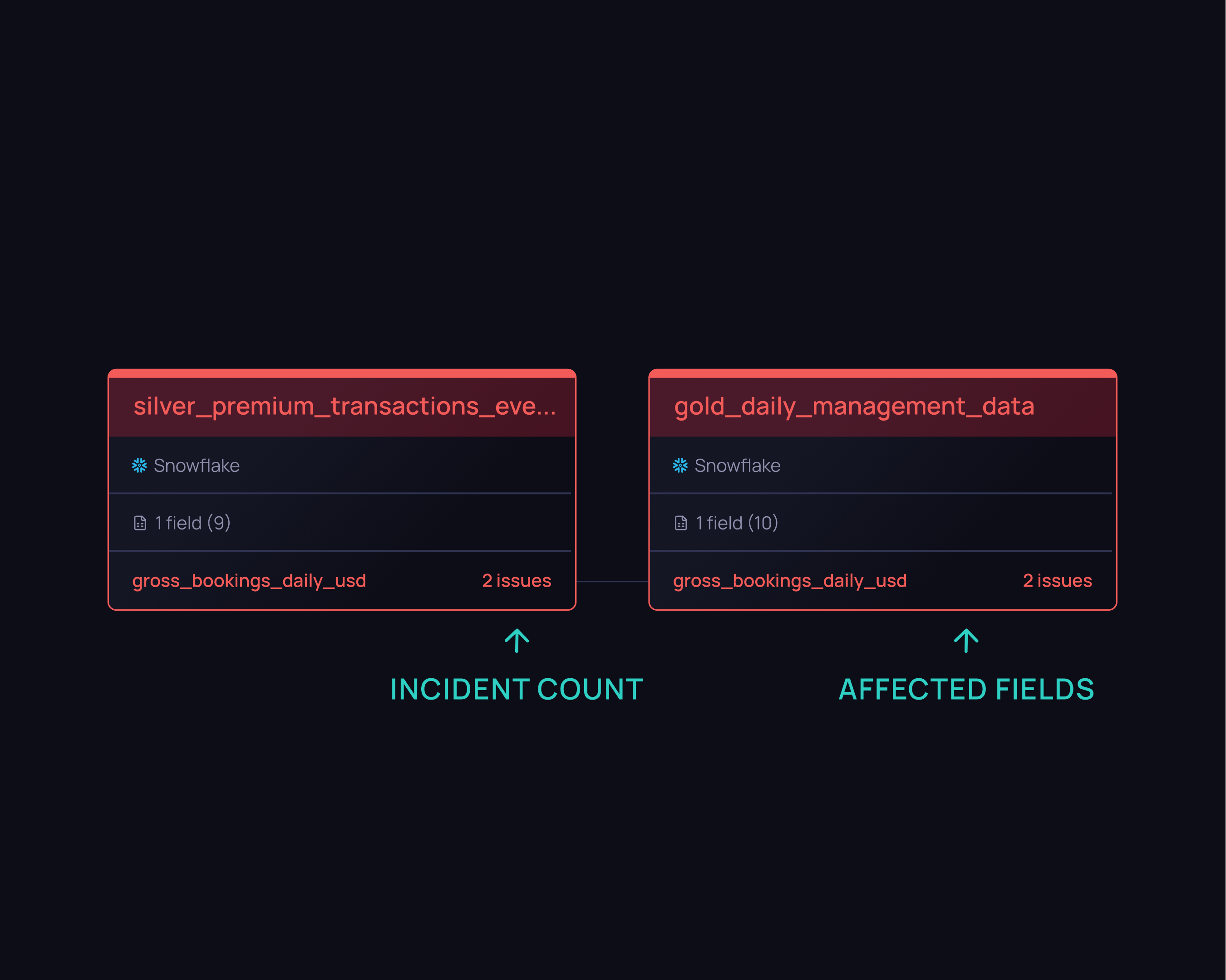 We showcase data quality metrics directly in your lineage map and highlight the origin, severity, and impact of issues. Root cause analysis has never been easier.