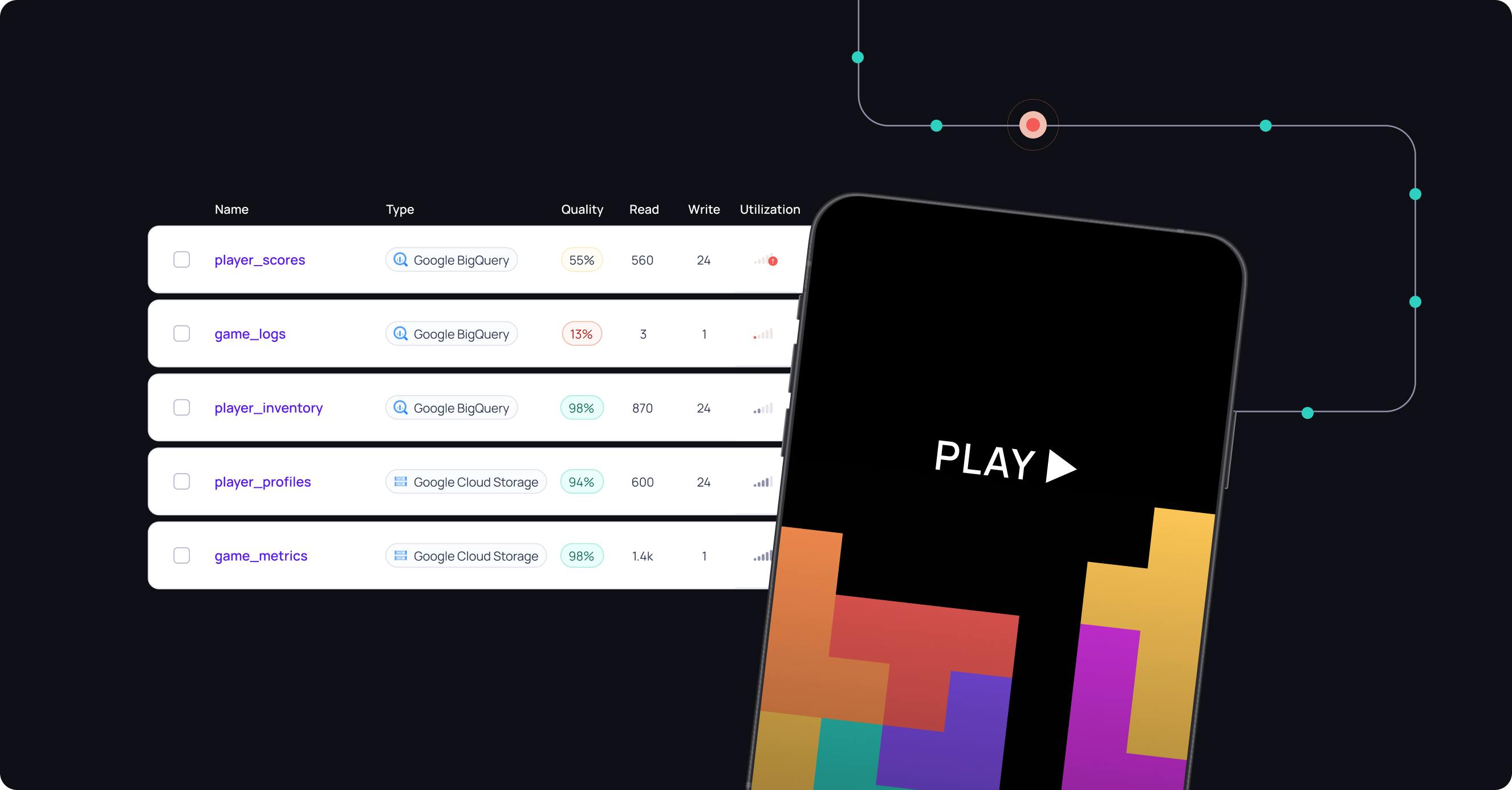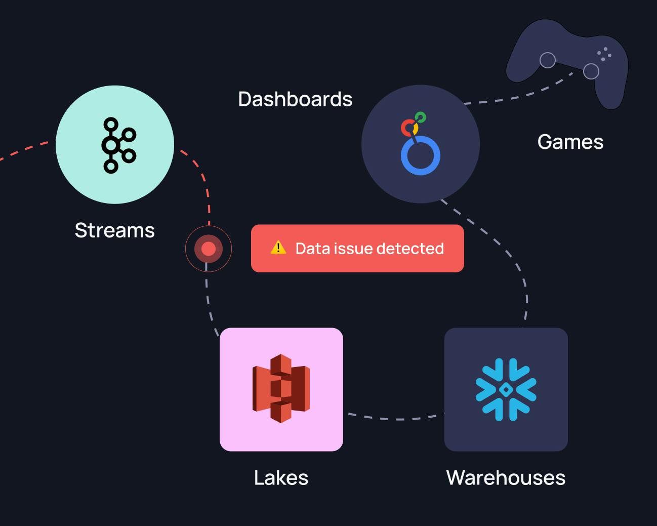 In gaming, understanding your player data. Validio targets data issues at their source so they can be addressed as soon as they occur. Get full visibility of your data’s journey—from source to report.