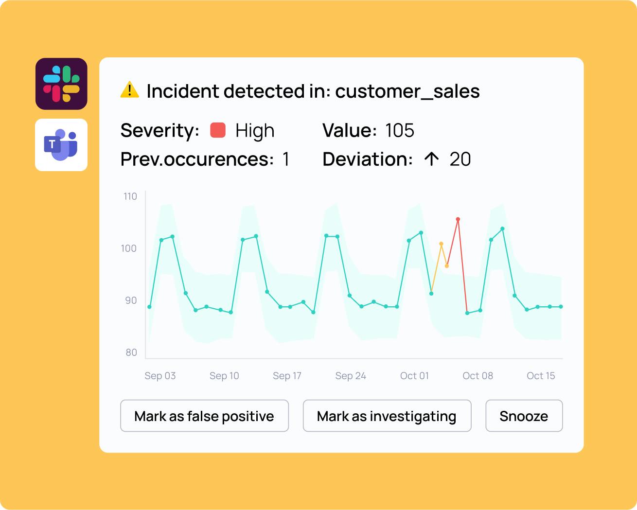 With easy to use interfaces, Validio allows all teams to make the most out out your data. Essential monitoring gets set up in minutes and incidents can be managed directly in Slack, Teams or your tool of choice. All so the customer facing teams can leverage customer data.